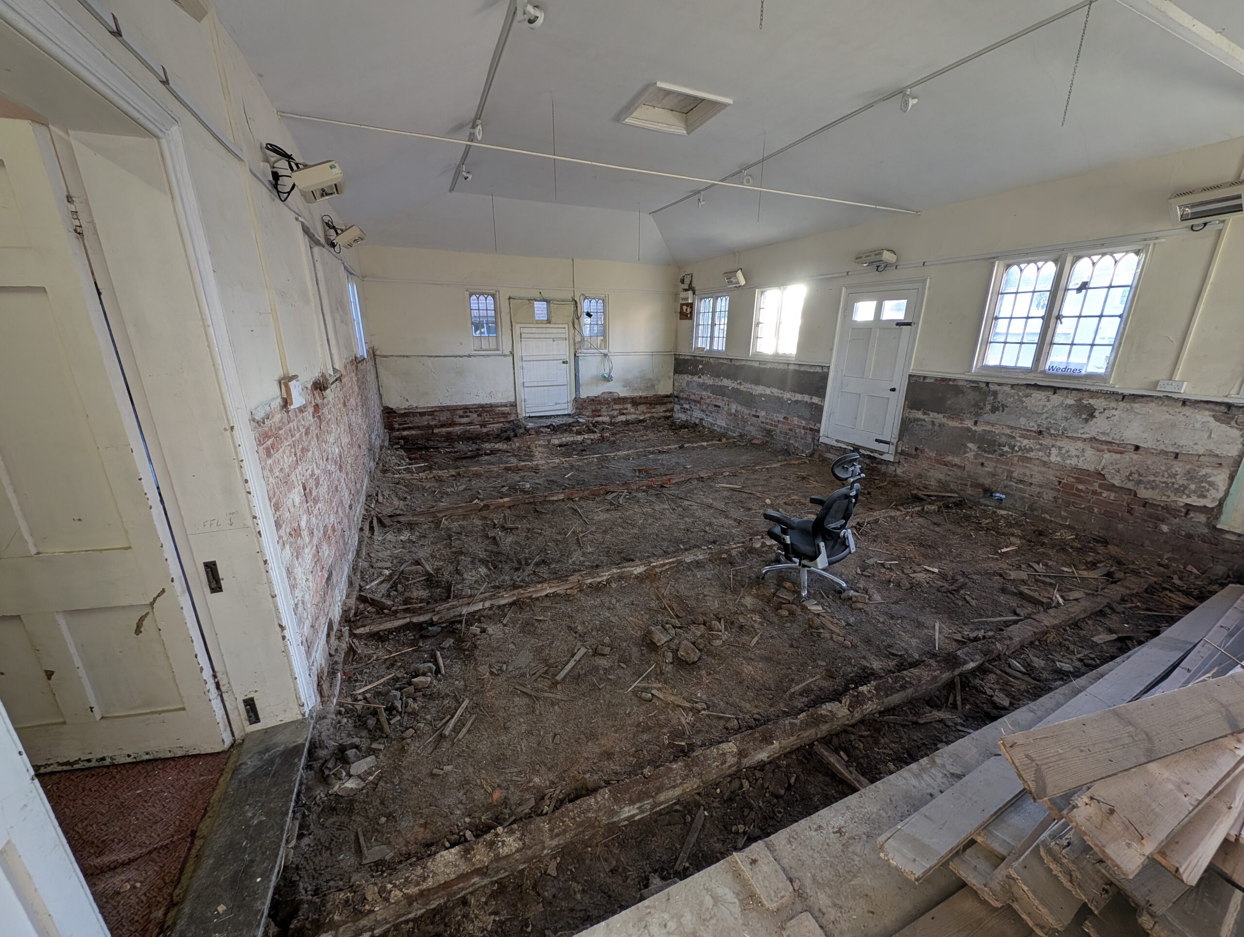 This last month, the team has been busy removing the internal porch, stage and floor from the hall and the kitchen, ready for improved damp and waterproofing and the under-floor heating.